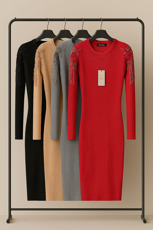 Abito in maglia a costine con applicazioni sulle spalle